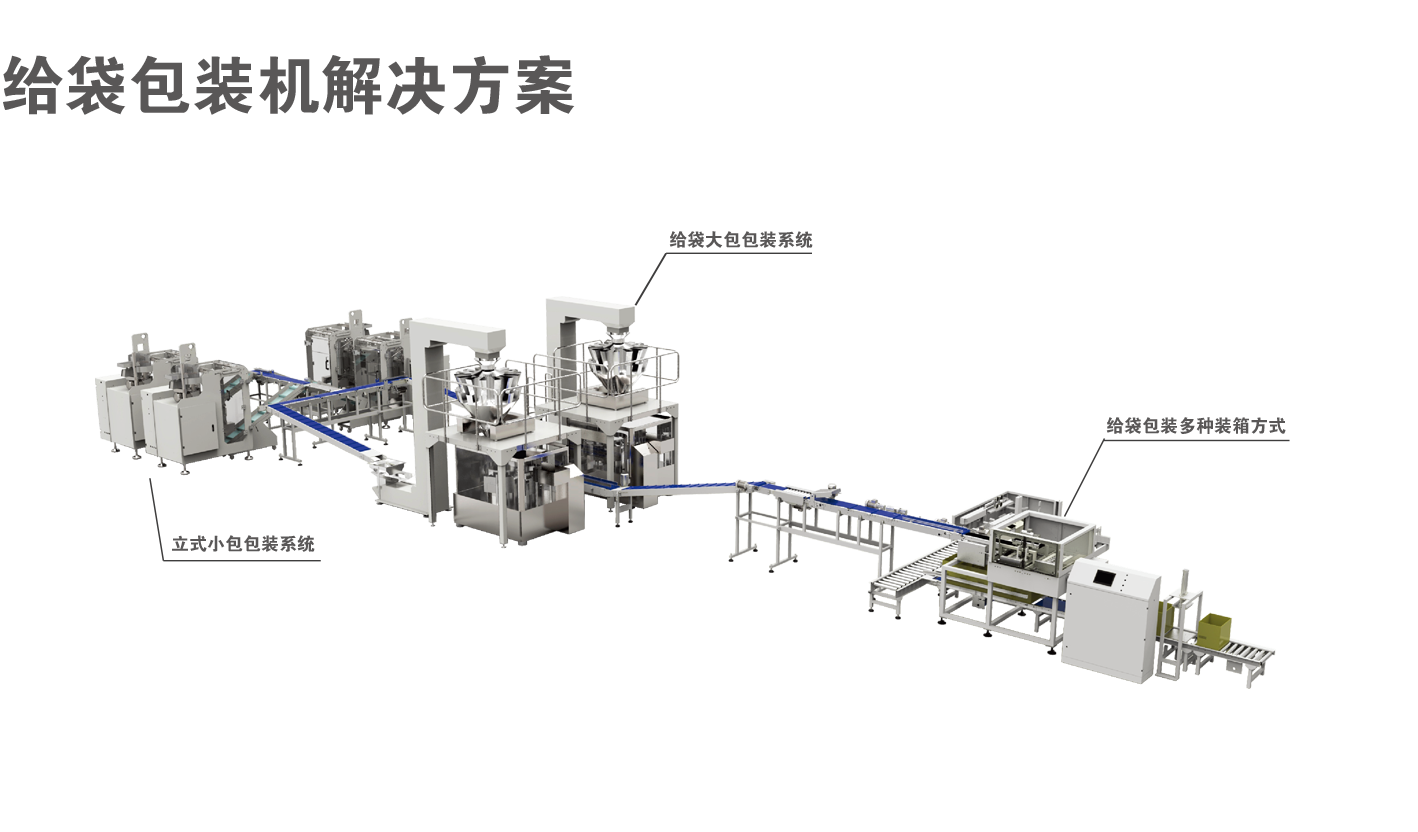 2.生产线配置有立式包装机若干台+小包整理输送线+斗式提升机+电脑组合屏+电子秤架台+大工位旋转给袋包装机GDR100K及成品出料输送系统一套,后端可配自动开箱机、装箱机、封箱机、喷码机、捆扎机、码垛机,并可利用机器人的先进技术使生产流程简单、准确、安全、迅速,满足灌装、喷码、码垛等自动化包装生产要求;